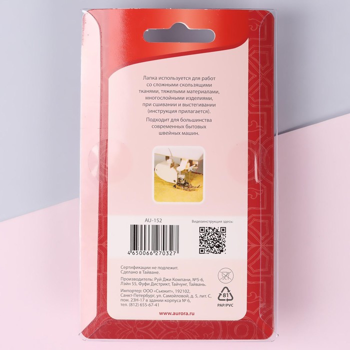The footing paw open, very convenient when sewing vinyl fabric, synthetic leather, silk, satin and other materials that are difficult to serve as an ordinary conveyor. Prevents the displacement of the layers of fabric relative to each other, is indispensable when sewing slippery fabrics for obtaining a flat line and quality product.