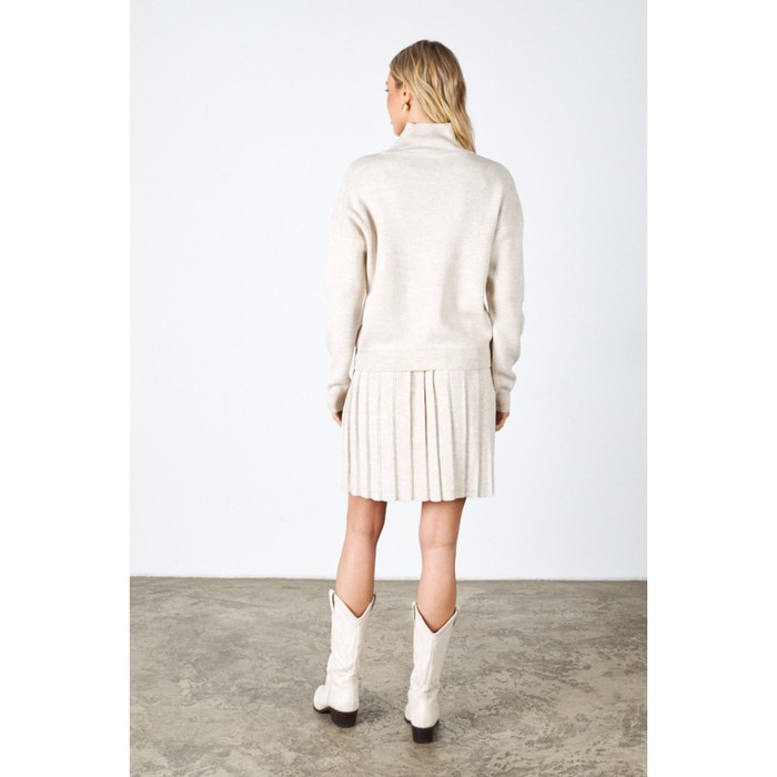 - The suit consists of a sweater and a skirt.