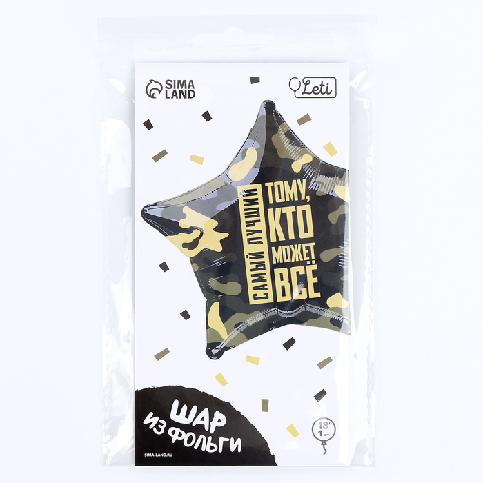 A foil ball in the form of a star with inscriptions: “The best” and “The one who can do everything” can be used as an addition to a gift to a beloved man, guy or boy. The design in the camouflage style is suitable for decorating the premises to celebrate the Day of the Defender of the Fatherland.