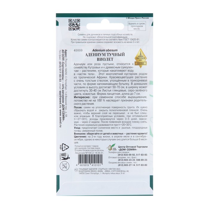 The adenium or desert rose belongs to the Kutov family family and wood succulents - plants that accumulate water in “parts of the body”. This long -term shrub is from tropical Africa. A beautifully flowering plant with a very thick trunk thickened in the basal part, in shape resembling a bottle. At home, it reaches 50-70 cm, in width can reach 30-40 cm glossy, gray-green, leathery leaves. The form is lanceolate, length up to 7 cm. Interesting: with the seed of growing, offspring not 100 % inherits the signs of the parental plant. Sowing: seeds in the bowls on the compacted surface of the soil. They need to be sprinkled with water and closed with plastic film. It is very important that the top layer does not dry out and is not too wet. In favorable conditions, under the optimal t =+27+300C, the seedlings will be interrupted after 3-5 days, a maximum of 2 weeks. After the emergence of the shoots, remove the film. Plants develop normally with T =+20+300C. Care: prefers a sunny place and loose, fertile soils; Moderate watering. Attention: protect from children and animals-the plant is poisonous. Vitriya: in the 2nd year of life, in April-July and in September-October, but in some cases it lasts more than 6 months.