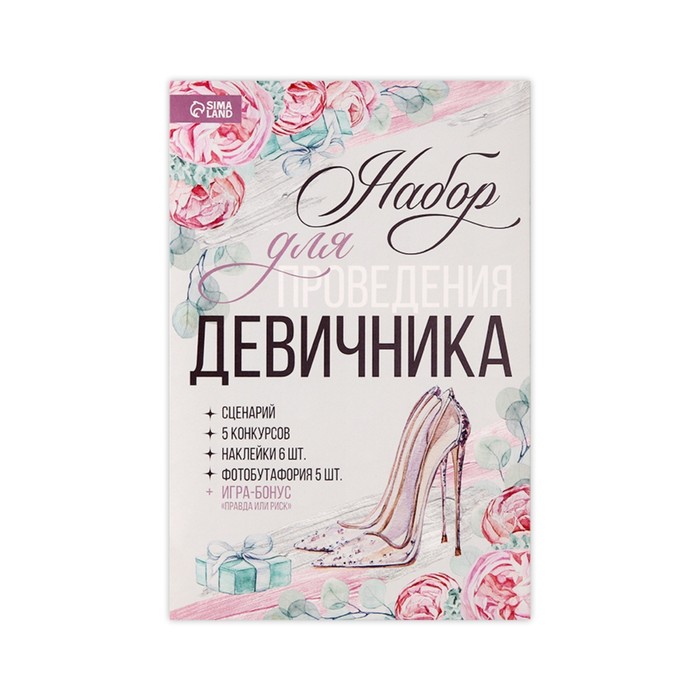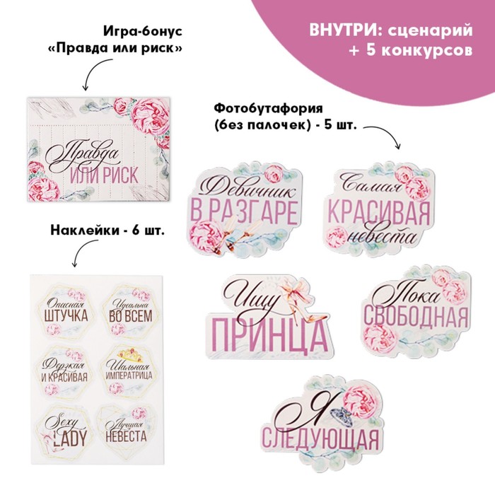 Arrange the most fun, bright and unique holiday for the bride, which will remain in memory for a long time. A set for holding a bachelorette party is ideal for a home party. This game will help to note him fun, sincerely and unforgettable. Prepare your favorite drinks and a great mood for each participant! The game is provided for 6 participants, but if desired, you can increase the number of people. The script includes 5 contests/games, also in the set you will find accessories for a photo shoot 6 pieces, stickers 6 pieces. A bonus for you will be the game "Truth or Risk".