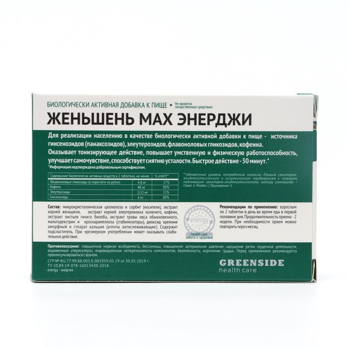 Composition: Microcrystalline cellulose and sorbitol (carriers), ginseng and roots of prickly elevator roots, caffeine extracts, ginkgo biloba and martodecaramellose oatmeal (stabilizers), Axorphic dioxide (stabilizers).