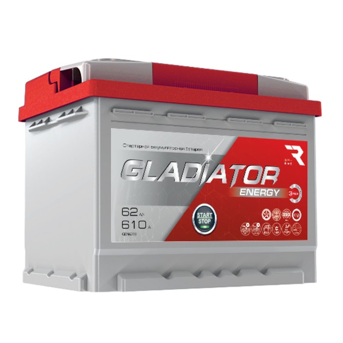 Gladiator Energy battery with a capacity of 62A/h, 610A launcher, direct polarity, type of cone output. 242x175x190