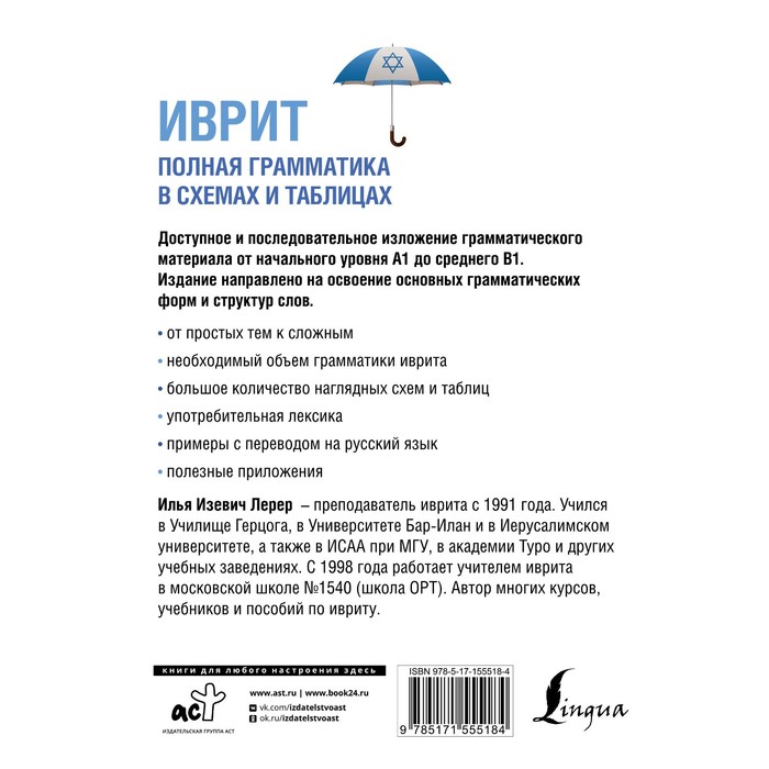 This manual will help readers master the basics of the grammar of modern Hebrew. In this book, you will find the rules of reading and pronunciation, the most necessary grammatical topics, a large number of examples with translation into Russian and use of vocabulary. Clear and visual schemes and tables will help to learn or repeat the material as efficiently as possible.