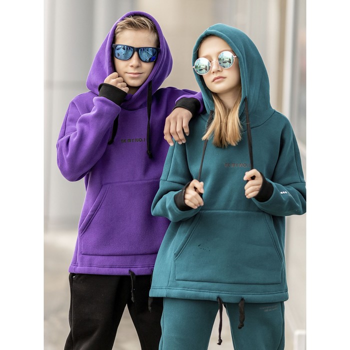 HUGE OF HEPPI Children's Violet is made with a hood and an inscription. The new knitwear collection is made of a premium segment: 3 threads with an beginning, a density of 300 gr. It has an eco-hacks and polyester in a ratio necessary to increase the stability of the canvas and color brightness. During operation, do not lose their shape, do not stretch on their knees and elbows, after washing do not roll.
