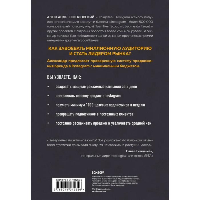 Inside the experience of the content marketer and the founder of the host of the Instagram automation service. Tools for promoting a business account and a personal brand, strategic recommendations and technological innovations-all information is supported by the analysis of real businesses with millions of revolutions. You will not just learn how to beautifully arrange accounts and write selling texts - you will learn how to coat a portrait of the target audience, understand your client, target it as a fish for a bait and hit in the very heart with your creative posts.