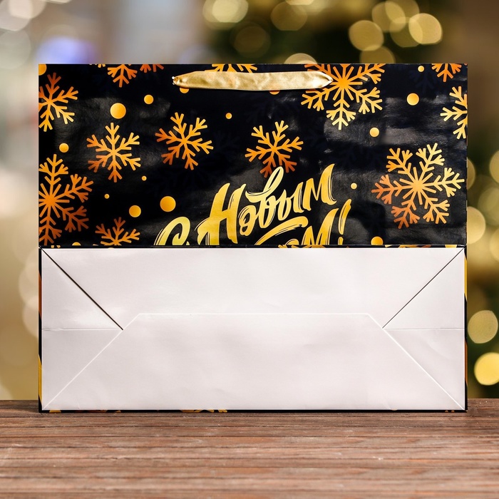 A stylish New Year's lamination package is used as a gift for a gift. Due to his original design and attractive appearance, he will create a festive mood for the recipient and will not leave it indifferent.