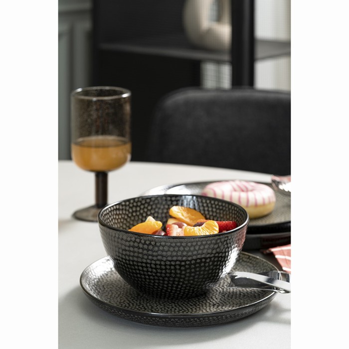 To create a Dots collection with a unique texture and color scheme, experienced masters used a reactive glaze method when several layers of special glaze are applied to the surface of the dishes.