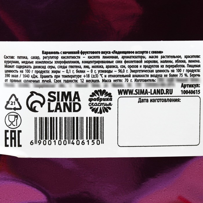 Composition: molasses, sugar, acidity - citric acid, flavorings, vegetable oil, dye - turmeric, copper complexes of chlorophylline, concentrated juices: purple carrots, raspberries, apples, lemon. It may contain sulfur dioxide, traces of gluten, eggs, milk, arachy, soy, nuts and their processing products.