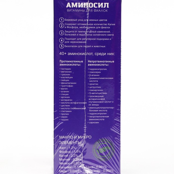 Thanks to micro and macro elements of organic origin, Aminoil, gives violets long-term and intensive flowering, and also ensures the qualitative growth and development of the plant. Aminoil vitamins take an active part in the process of plant metabolism. In fact, they are elements or bricks, thanks to which the construction of plant cells occurs. Dosage: only 10 ml per 1l of water.