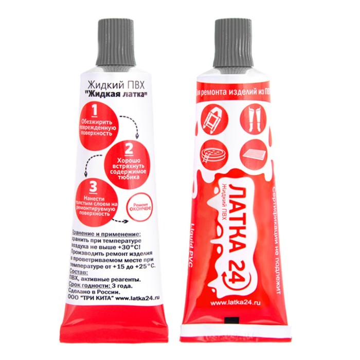 Repair can be made at home, before starting to familiarize yourself with the instructions for use. Penetrating into the outer layer of the repaired surface, the "liquid Latka 24" creates a strong connection, increasing the strength of the compound. Unlike various adhesives, this is the original PVC from which the repaired product consists of, the lak is not afraid of ultraviolet radiation. It penetrates the basis of the repaired product 100%, updating the damaged PVC. Saves all the properties of the main material, in severe frost your product will be easily bending.