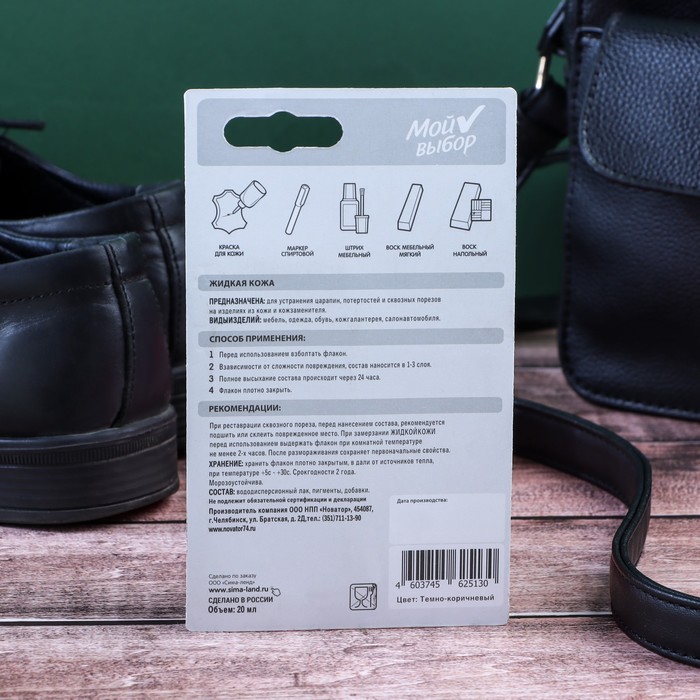 Liquid skin to eliminate scratches, scuffs and through cuts on leather and leatherette products. Types of products furniture, clothing, shoes, leather-scale, car interior.
