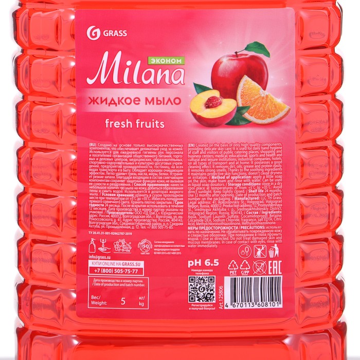 Milana Fresh Fruits liquid soap is created on the basis of only high -quality components, which provides delicate skin care. It is used for daily hygiene of the hands of personnel and visitors to catering organizations, shopping and business centers, medical, educational, sports, health and cultural and leisure institutions, industry enterprises, hotels, all modes of transport and in everyday life.