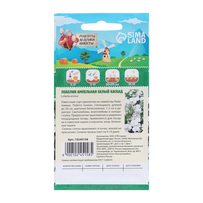 A well -known one -of -element from the Lobeliev family. The shoots are thin, creeping, up to 50 cm long. Snow-white flowers, 1-2 cm in diameter. Separate, moisture loving and cold -resistant. Prefers loose and moderately fertile soils. It is used for planting in hinged pots and baskets, vases, balcony boxes. The seeds are slightly pressed into the soil, they are not sprinkled with earth. Seeds germinate for 9-10 days.