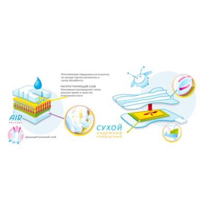 - Elastic sides will protect the baby from leakage. Thanks to soft elastic bands, the diaper is reliably fixed on the legs, providing comfort during active games and on a walk.