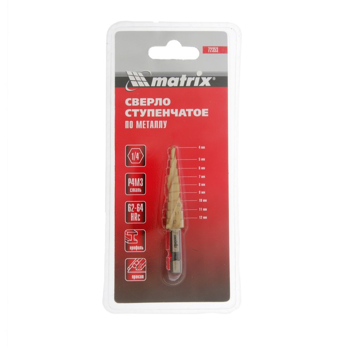 Matrix drill is designed to create holes in sheet and thin -walled metal. The equipment is made of high -speed steel with a nitridetan coating and withstands large shock loads and severe overheating. The product has the shape of a cone and consists of steps that have smooth transitions. This allows you to get a neat hole of the desired diameter.