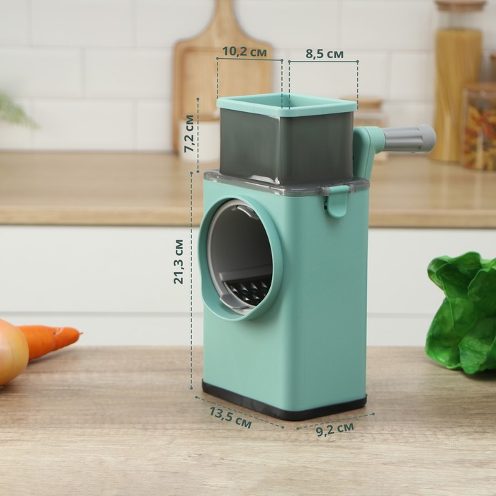 The nozzle and the sliser are inserted into the neck with a handle, products They are laid on top in the receiver. For safety, a pusher is provided so that crushed vegetables do not need to be touched with hands. With the rotation of the handle, the nozzle also rotates, grinding the product.