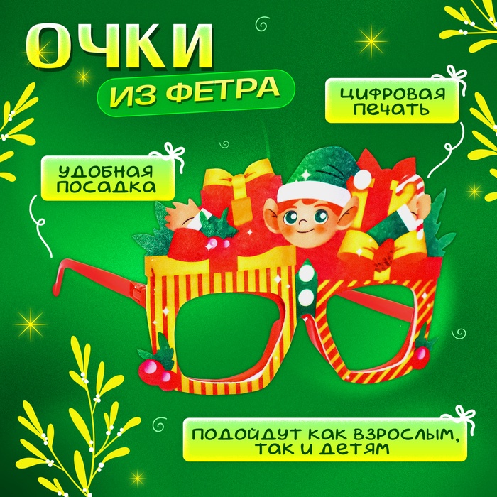 Carnival glasses “New Year's gift” - funny glasses with the image of a smiling elf, surrounded by festive gifts, will create a unique festive mood.