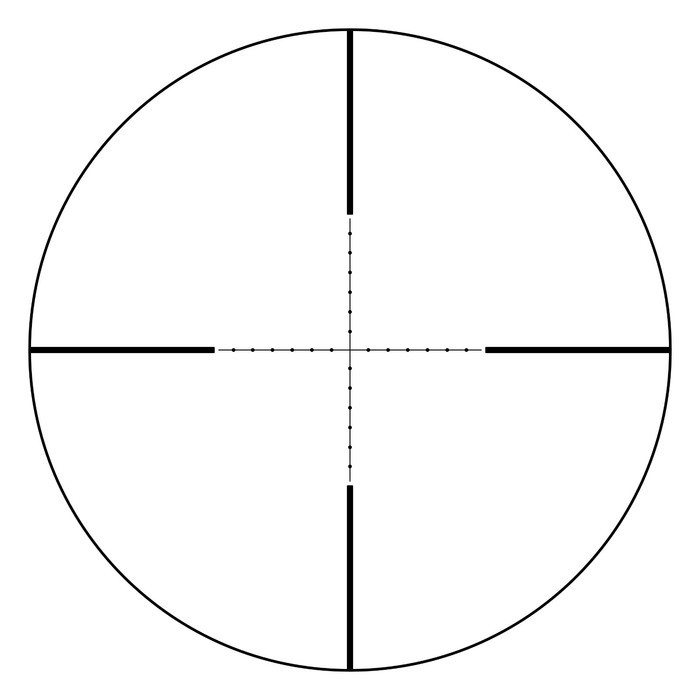 The aiming grid (tactical mil dot) is made by the method of etching on the glass and is located in the second focal plane of the sight. With a change in the frequency of the sight, the size of the grid visually remains the same.