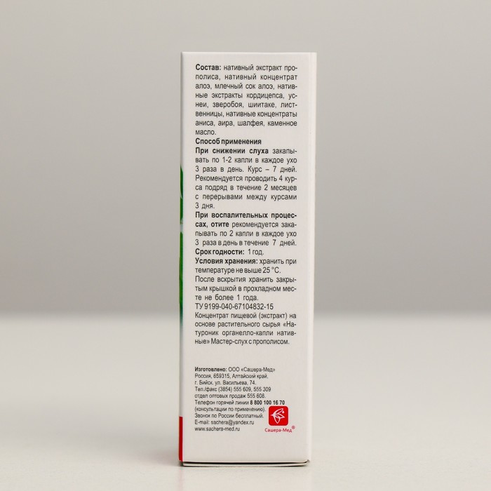 “Naturonika” ® master with propolis, an organell-frame is a native plant complex of enhanced action on hearing organs with anti-inflammatory, antibacterial, anti-infectious effects. Native plant extracts activate the processes of regeneration and restoration of cells of the auditory organs during mechanical, traumatic, neurosenate and infectious damage to the eardrum, auditory nerve, hair cells, restore blood circulation and transmission of sound impulses to the brain, as a result they help improve the perception of sound. P> Composition: Native propolis extract, aloe concentrate, aloe aloe, native cordyceps extract, Plosa's native extract, native St. John's wort extract, purest extract, native anise concentrate, native calamus concentrate, native sage concentrate, stone oil oil, stone oil.