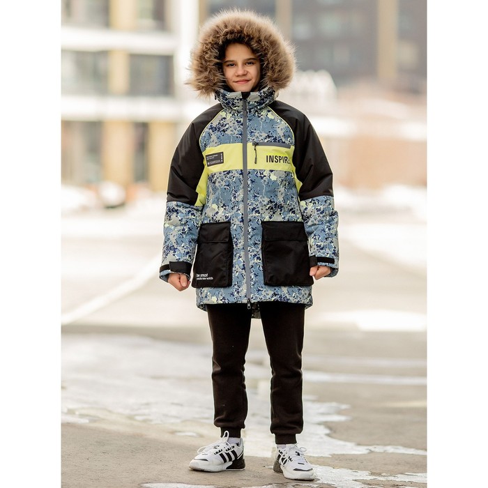 The Liman Park for a boy is made of a membrane fabric with a current print, reminiscent of a geolocation map, bright neon finish with cows and inserts on the sleeves.