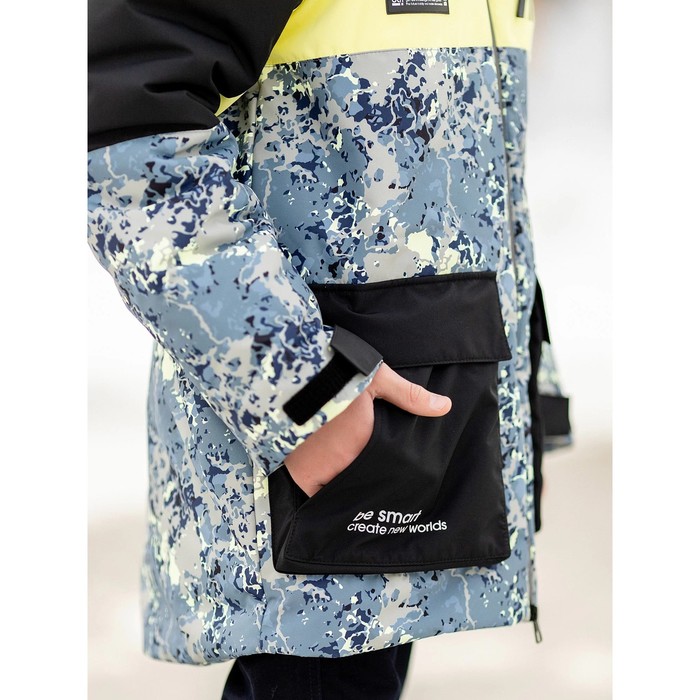 The Liman Park for a boy is made of a membrane fabric with a current print, reminiscent of a geolocation map, bright neon finish with cows and inserts on the sleeves.