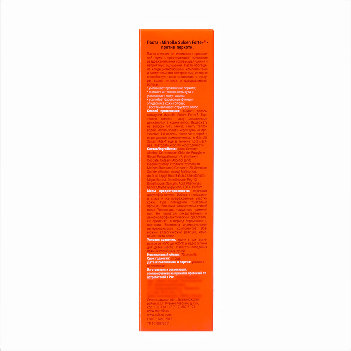 Method of application: Wash the hair with mirrolla sulsen forte shampoo. Thoroughly rub the paste with massage movements into the hair roots. Sin on the hair for 5-10 minutes, wash off warm water.