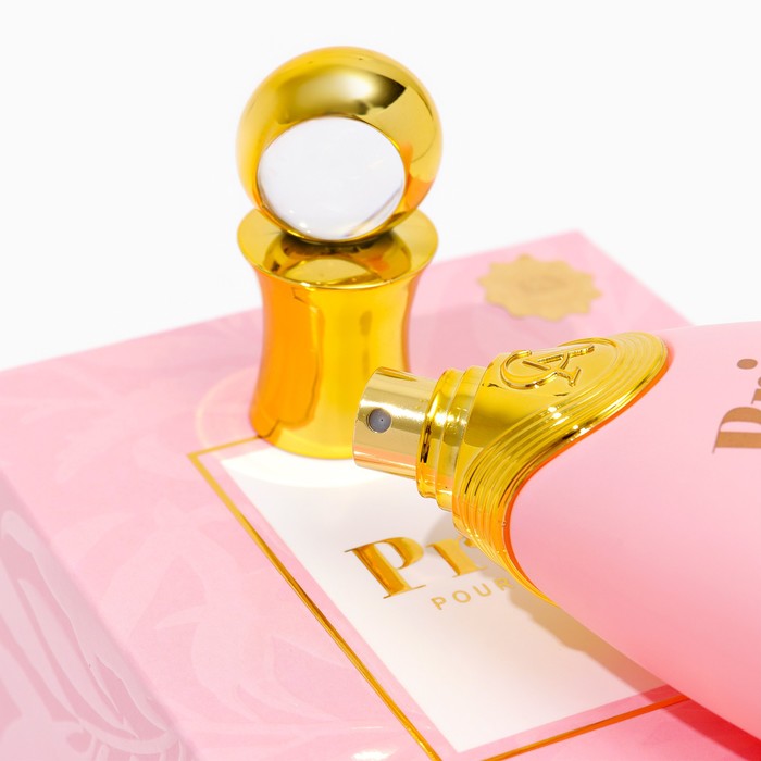 The bottle of perfume water Chris Adams Prize is decorated in pink tones with a spray, and packed in a pink cardboard box with gilded edges, giving aroma, giving aroma. Survival and style.