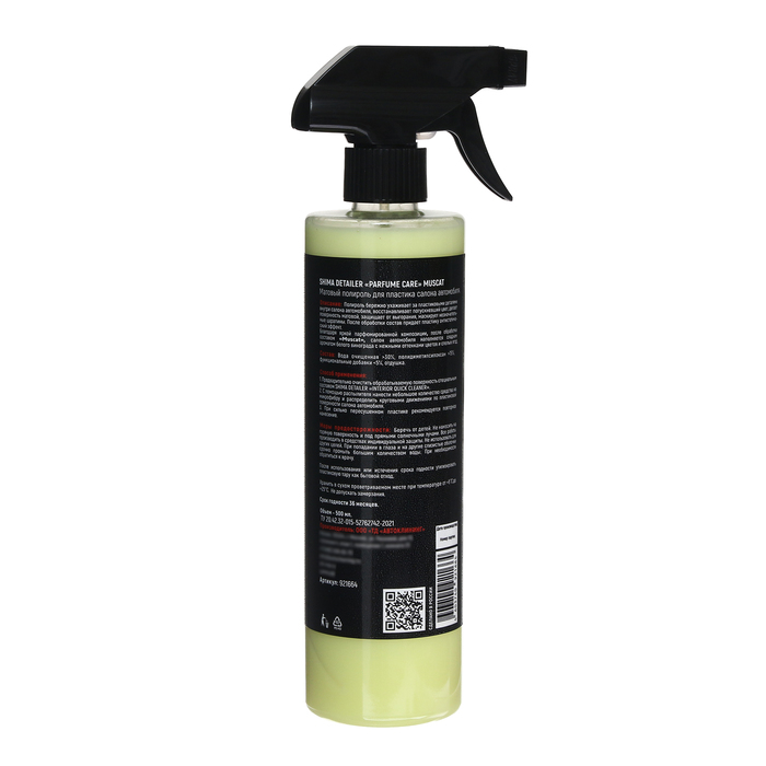 The polish carefully cares for plastic details inside the car interior, restores faded colors, gently cleanses and makes the surface matte, protects from burnout, masks minor scratches. After processing, the composition gives plastic an antistatic effect, prevents the settlement of dust and dirt. Thanks to the bright perfumed composition, after processing the composition of Muscat, the car interior with a sparkling aroma of white grapes.