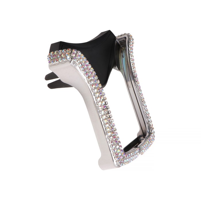 A phone holder with rhinestones, easily installed on the air duct deflector. Suitable for most car models. The mobile device is fixed in the holder by clip.