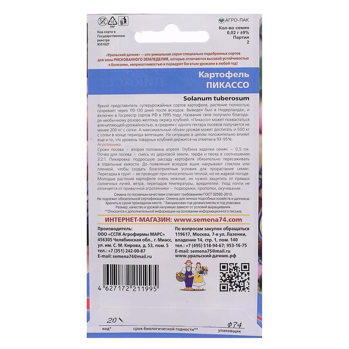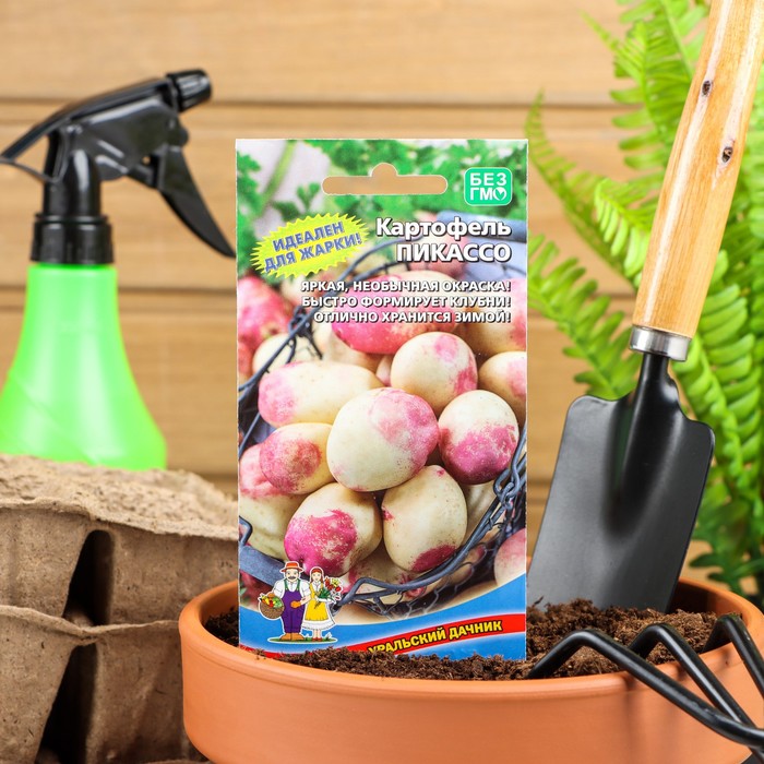 Late -pharying table of table purpose. The ripening period to landing to harvest 110-130 days. The name was due to the unusual color of tubers. Picasso boasts impressive yield, on average from the 1st crops it turns out at least 20 tons of potatoes. From one bush you can collect up to 20 tubers. The tubers are round-oval. The peel is light yellow with characteristic pink eyes and the same spots around them. Cream-colored pulp with a slight starch content-10-12%. The taste of the variety is excellent (5 on a five -point scale) and, moreover, the variety has a long period of safety.