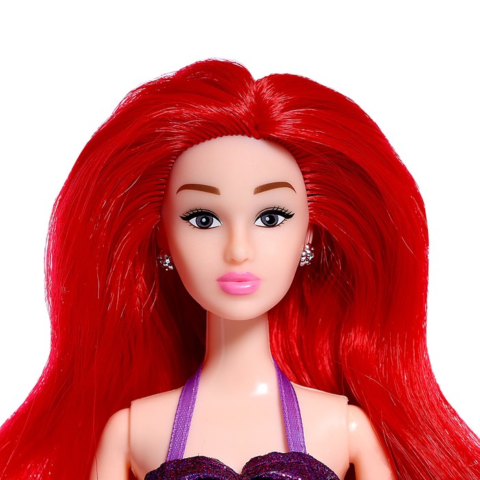 The mermaid has beautiful hair. Comb them and make a fashionable hairstyle. The hair is stitched throughout the head. The tail is removed, under it an ordinary doll with legs. Invent a festive outfit for the mermaid.