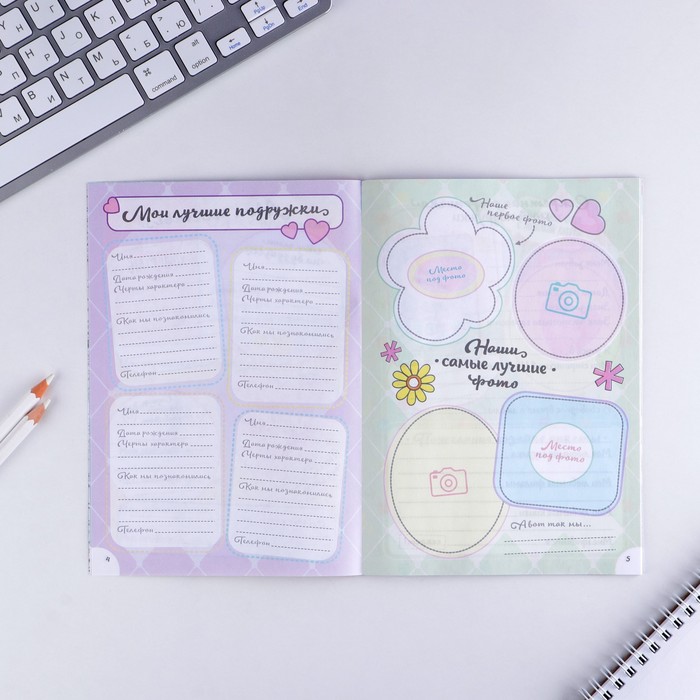 Our bright questionnaire will appeal to any little princess. She will write down her hobbies here, share his secret thoughts and secrets, make plans for the future. The girl will learn to expand thoughts and analyze the actions.