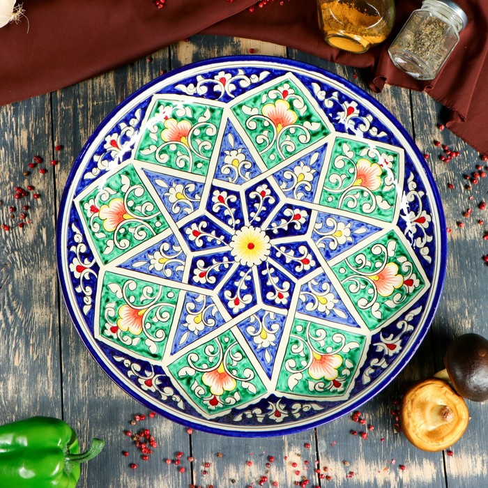 Round Laragan "Rishtan", 36 cm, green, white-blue ornament