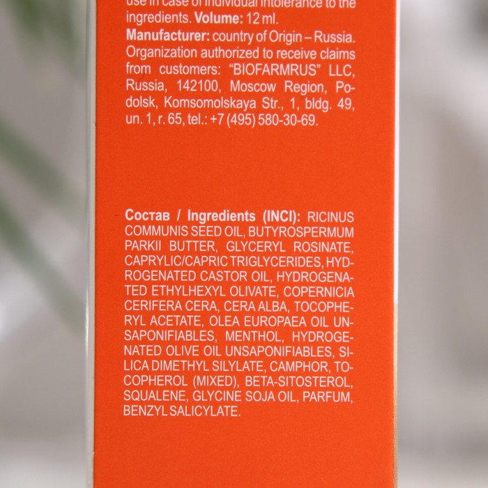 Состав: ricinus communis oil, butyrospermum parkii butter, glyceryl rosinate, caprylic/capric triglyceride, hydrogenated castor oil, hydrogenated ethylhexyl olivate, copernicia cerifera cera, cera alba, tocopheryl acetate, olea europaea (olive) oil insaponifiables, menthol, hydrogenated olive oil unsaponifiables, silica dimethyl silylate, camphor, tocopherol (mixed), betasitosterol, squalene, glyceryl linolenate, fragrance, benzyl salicylate.