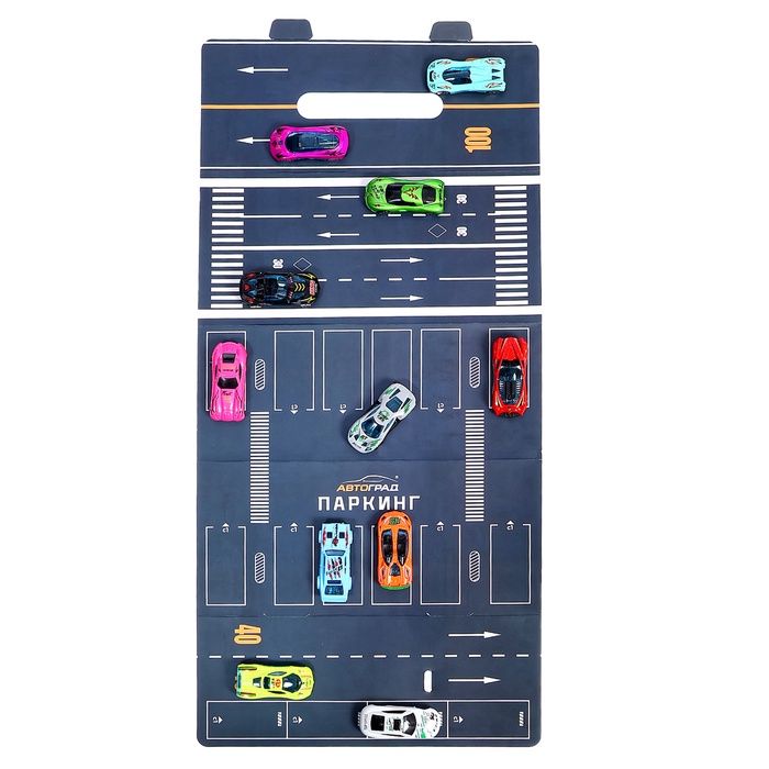 - В комплект входит складной коврик-паркинг с разметкой, позволяющий создавать маршруты и удобно парковать машинки.
