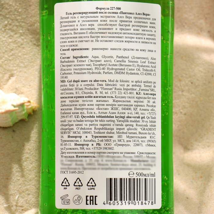 Гель регенерирующий Floresan пантенол алоэ вера, после солнца, 500 мл
