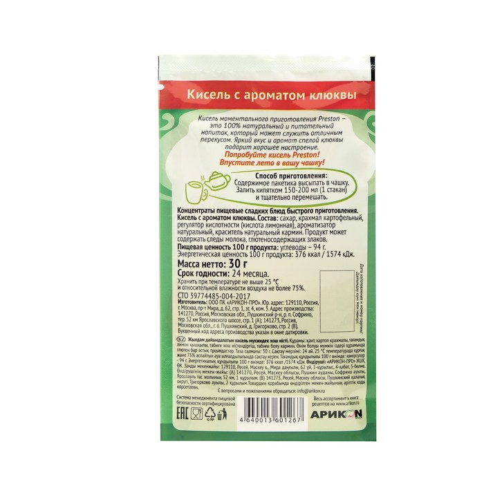 Кисель с ароматом клюквы Preston, м/п, 30 г