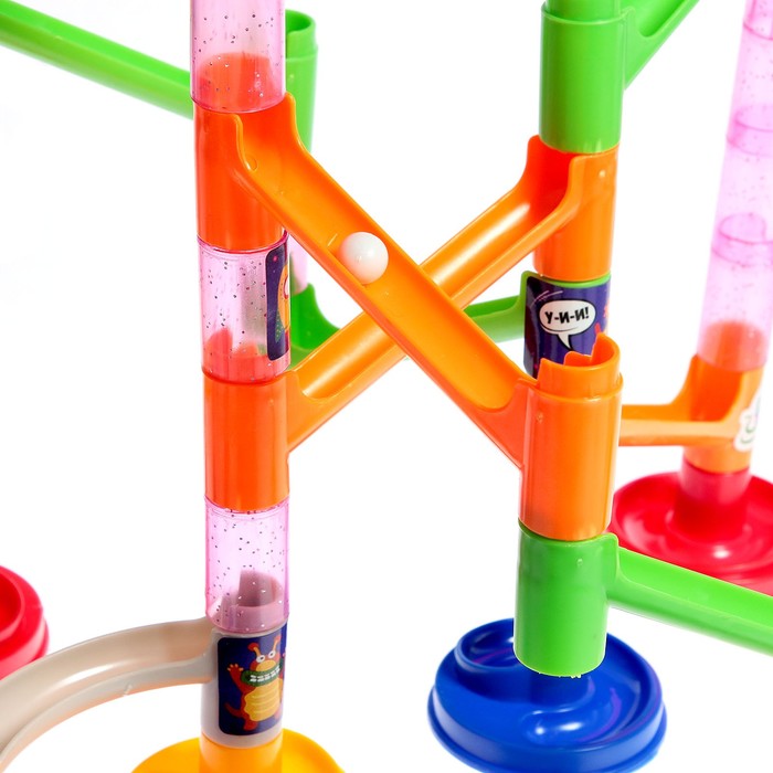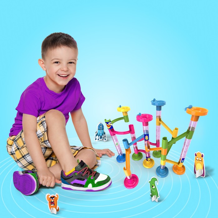 Набор состоит из прозрачных трубочек, разноцветных мостиков, извилистых дорожек и мельниц.