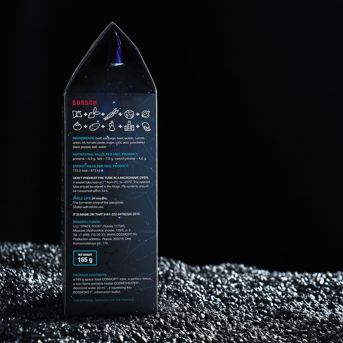 По составу борщ почти не отличается от привычного земного. Но сытное космическое блюдо в компактном алюминиевом тюбике можно взять с собой куда угодно. Упаковка, в которую помещается 165 граммов еды, не боится коррозии и перепадов температуры. Она не требует холодильника. Даже если вы оставите тюбик на жаре, его герметичность не даст содержимому испортиться. И через год блюдо будет всё ещё готово к употреблению.