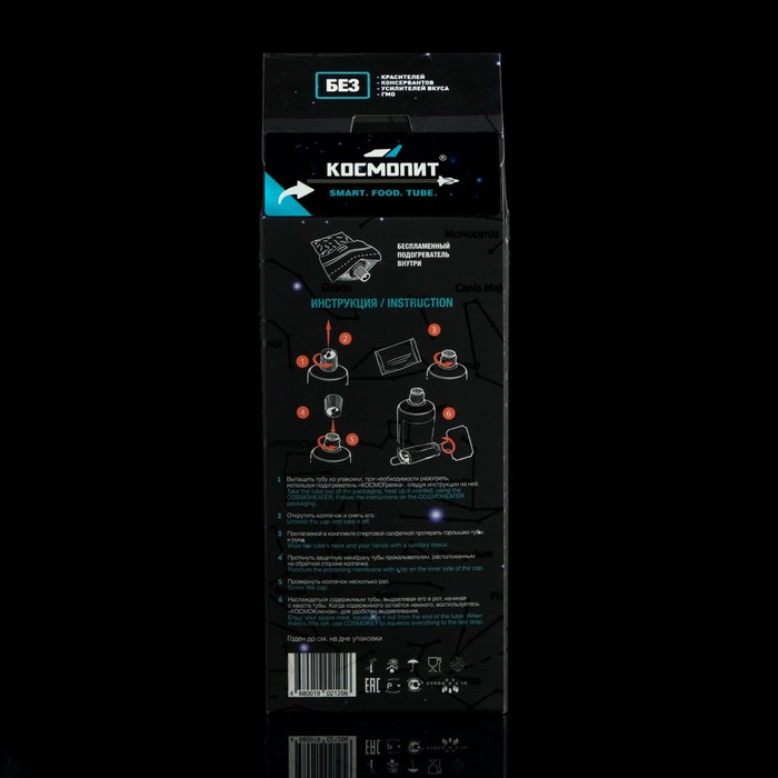 Сытные и вкусные блюда в проверенной тяжёлыми условиями космоса упаковке станут отличной альтернативой сухпайку во время выхода на природу, на охоте или рыбалке. Недостаток места, отсутствие костра и даже экстремальная погода больше не помешают обеду. Вам нужно будет просто разогреть тюбик на портативном нагревателе из комплекта и насладиться вкусной пищей.