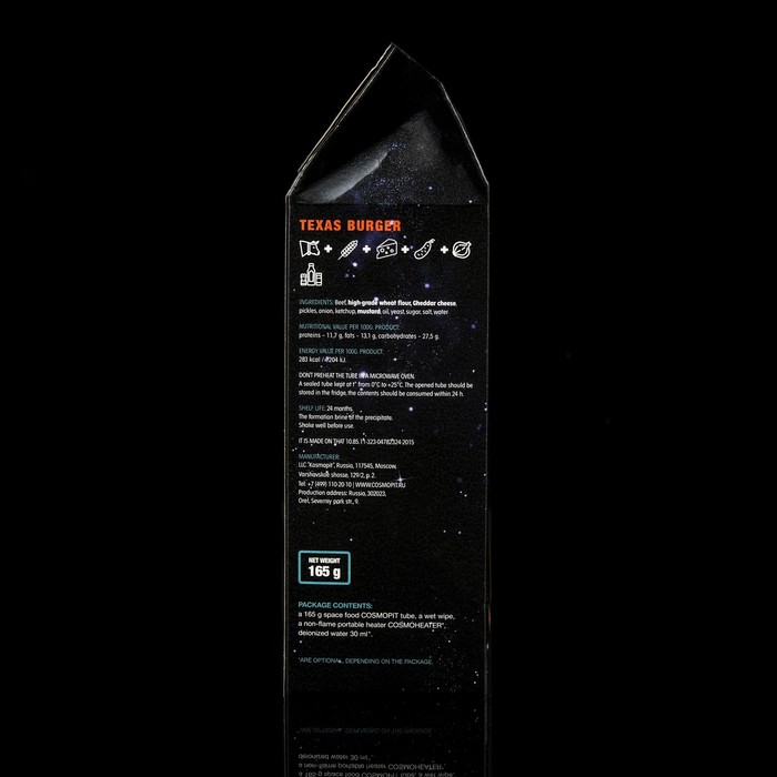 По составу космический бургер с сыром почти не отличается от привычной земной. Но сытное космическое блюдо в компактном алюминиевом тюбике можно взять с собой куда угодно. Упаковка, в которую помещается 165 граммов еды, не боится коррозии и перепадов температуры. Она не требует холодильника. Даже если вы оставите тюбик на жаре, его герметичность не даст содержимому испортиться. И через год блюдо будет всё ещё готово к употреблению.