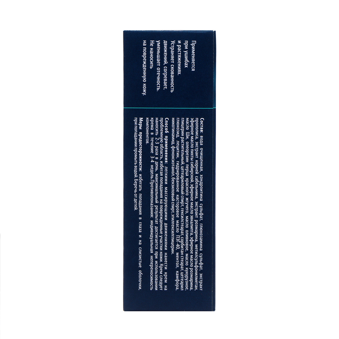 Состав: вода очищенная, хондроитин сульфат, глюкозамин сульфат, экстракт прополиса, экстракт корней сабельника, экстракт розмарина, метилсульфонилметан, эфирное масло пихты сибирской, эфирное масло эвкалипта, эфирное масло розмарина, масло Ши, олеорезин перца красного жгучего, масло оливковое, масло кукурузное, глицерин растительный, цетеариловый спирт, гексилстеарат, сорбитан стеарат, цетеарил глюкозид, лецитин, гидрированное касторовое масло ПЭГ-40, ментол, камфора, никотинамид, феноксиэтанол, бензиловый спирт, этилгексилглицерин.