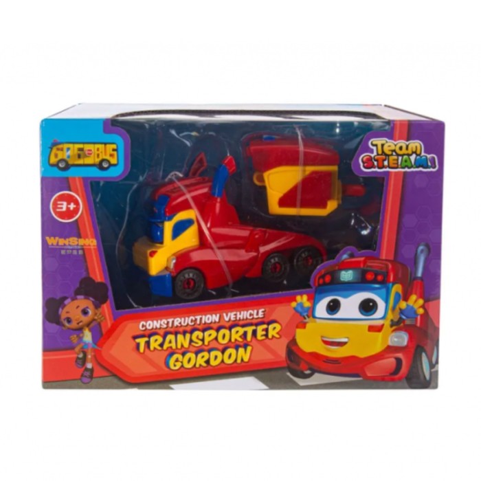 Машина-бульдозер с ковшом из серии строительные машины по мотивам мультсериала Команда Steam и Автобус Гордон понравится всем любознательным малышам. У машинки яркий красный цвет корпуса, синие элементы, весёлая мордочка, а также закруглённые безопасные углы и прочные колеса.