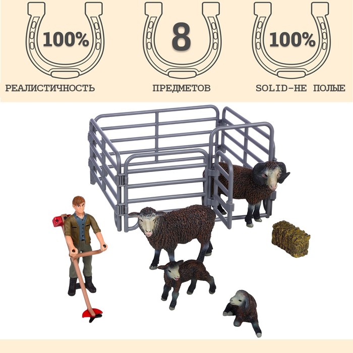 — Фигурки семьи баранов, фермера, загона и аксессуаров являются уменьшенными копиями реальных животных и предметов.
