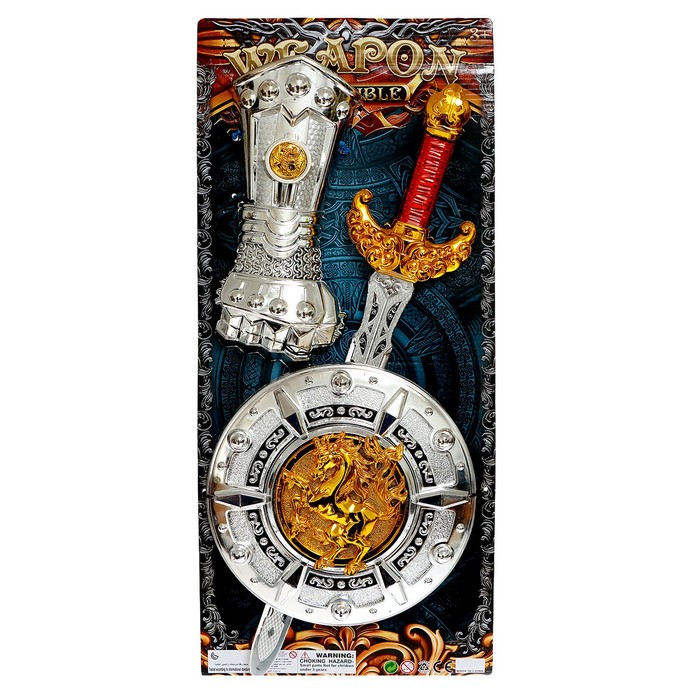 - В комплект входят 3 предмета: щит, меч и перчатка, которые помогают создать образ отважного рыцаря.