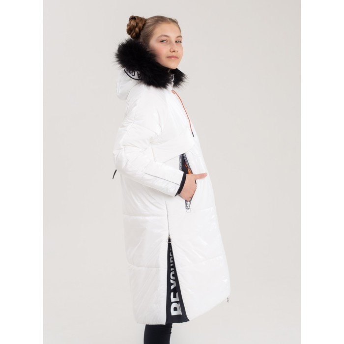 Пальто зимнее для девочки «Глория» утеплённое от Batik - красивая модель в стиле спорт-шик. Низ фигурный, по спине удлинение. Перламутровая ткань в цвете белый жемчуг смотрится невероятно стильно. Опушка капюшона выполнена в контрастном чёрном цвете, её можно отстегнуть.