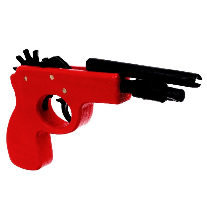 Пистолет выполнен из экологичного материала — дерева. В качестве снарядов используются простые канцелярские резинки.