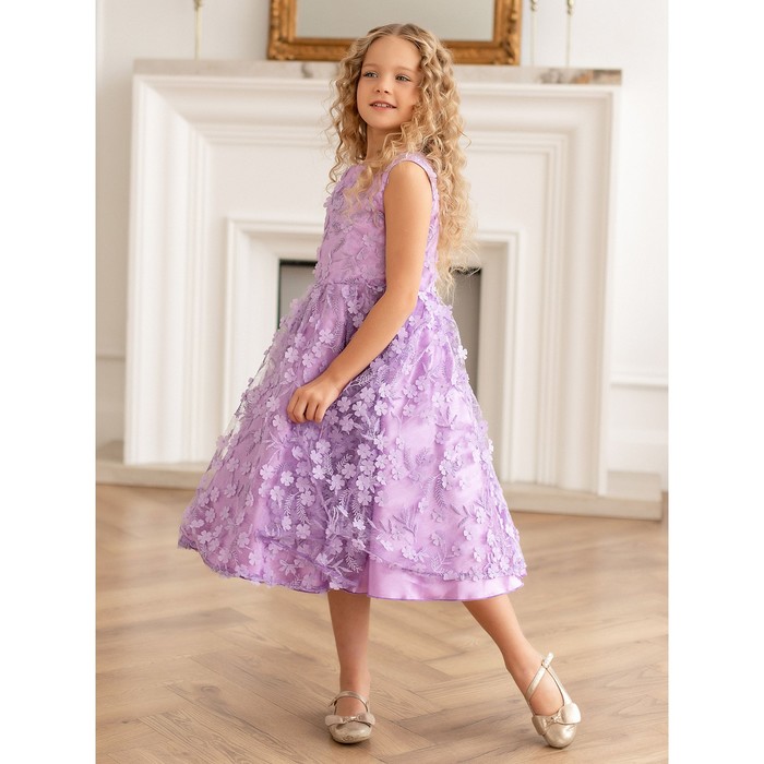 Нарядное сиреневое платье выполнено с пышной юбкой. Тонкая сетка с вышивкой. Подкладка 100% хлопок. Платье для девочки без рукавов украшено объёмными мелкими цветами.