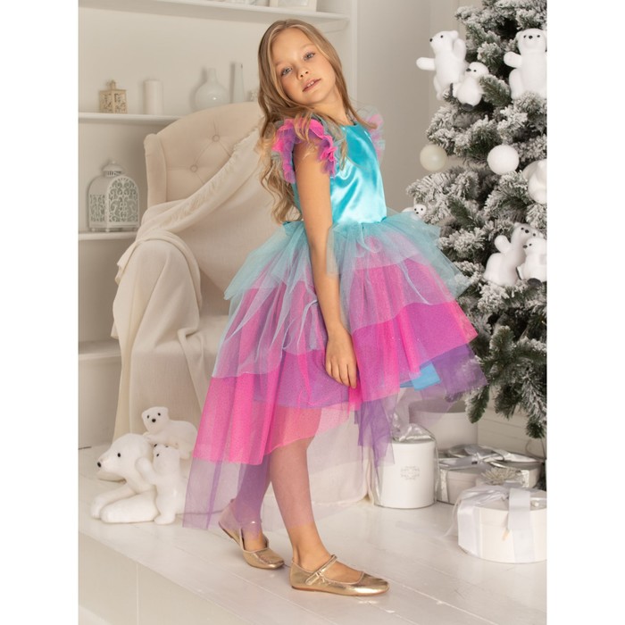 Платье «Мелоди» детское нарядное разноцветное выполнено из сатина. Пышная многослойная юбка со шлейфом. Блестящий атласный лиф. Короткие рукава с оборками. Завязка на спинке. Нарядное пышное платье подойдёт для любого торжества.